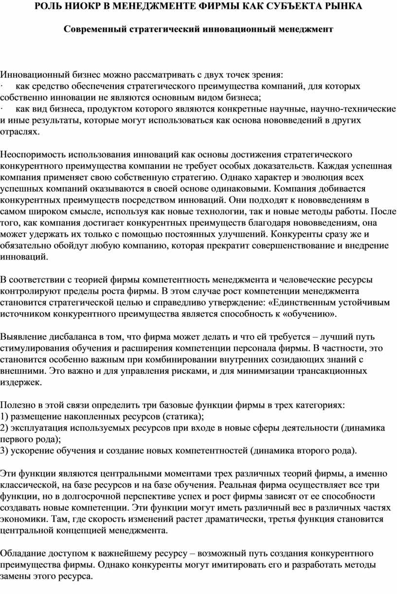 РОЛЬ НИОКР В МЕНЕДЖМЕНТЕ ФИРМЫ КАК СУБЪЕКТА РЫНКА