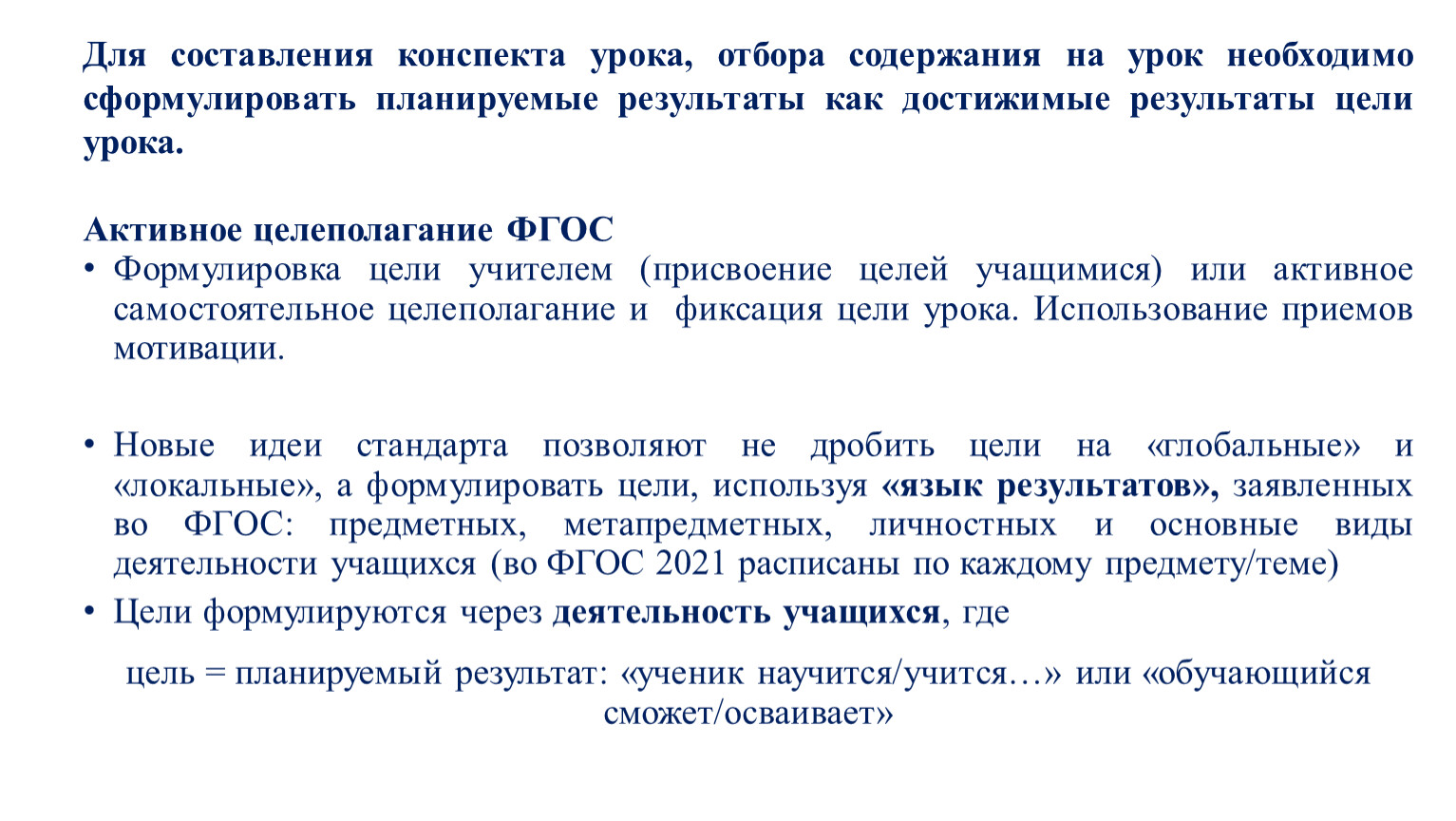 Новые идеи стандарта позволяют не дробить цели на «глобальные» и «локальные», а формулировать цели, используя «язык результатов», заявленных во ФГОС: предметных, метапредметных, личностных и основные виды деятельности учащихся (во ФГОС 2021 расписаны по каждому предмету/теме)
