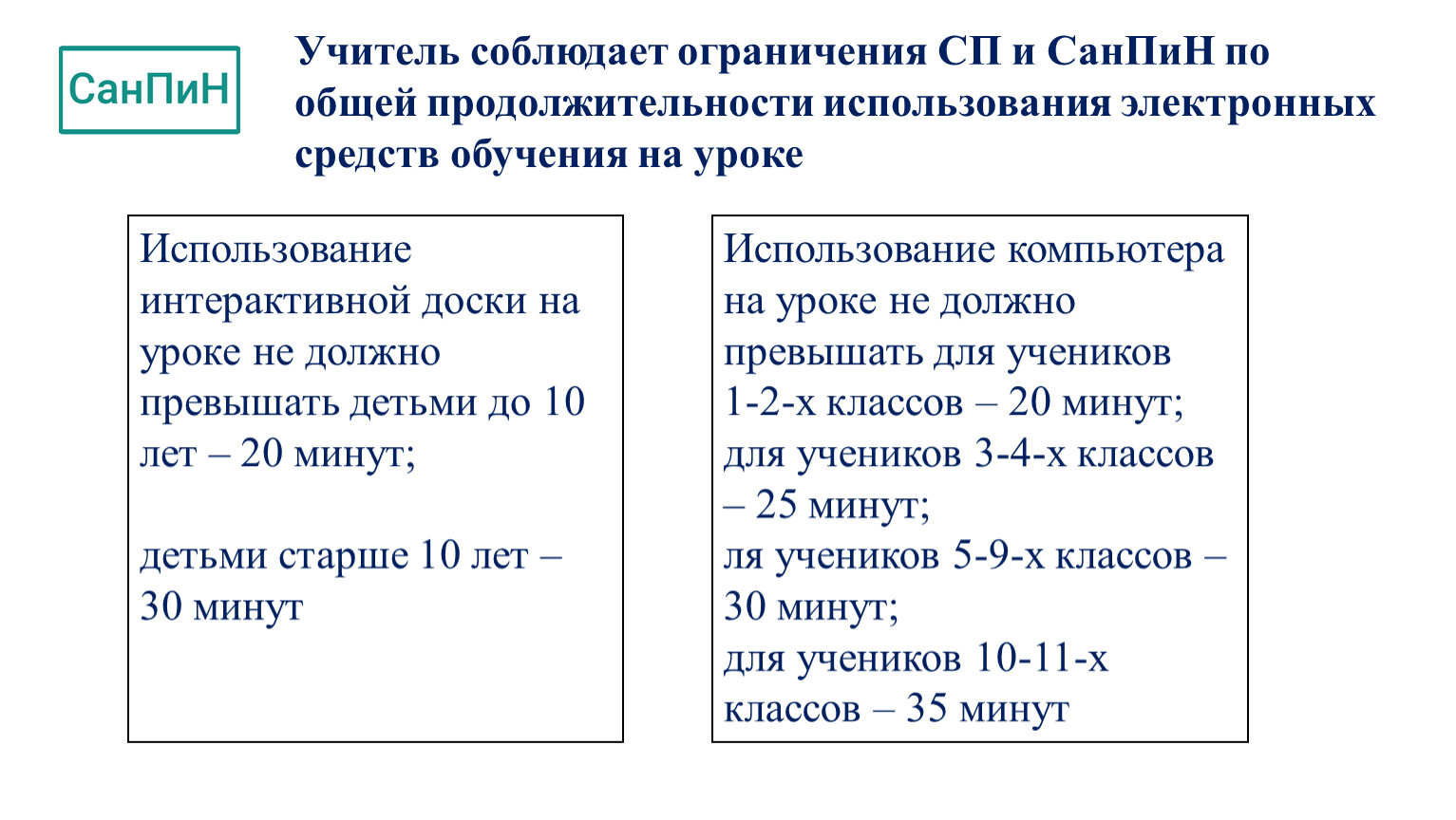 Учитель соблюдает ограничения СП и СанПиН по общей продолжительности использования электронных средств обучения на уроке