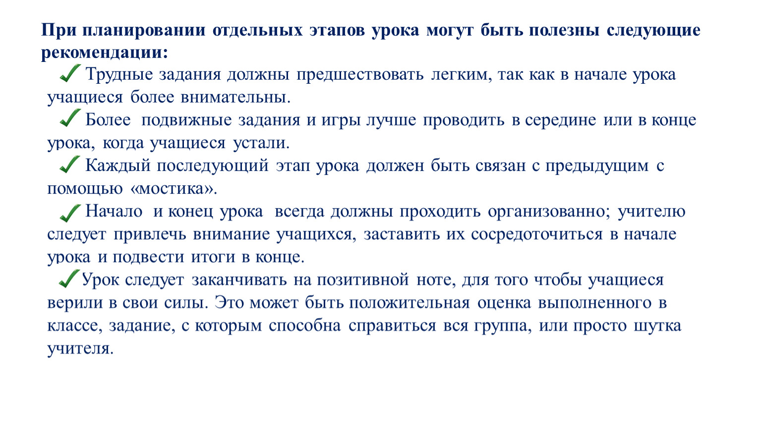 При планировании отдельных этапов урока могут быть полезны следующие рекомендации: