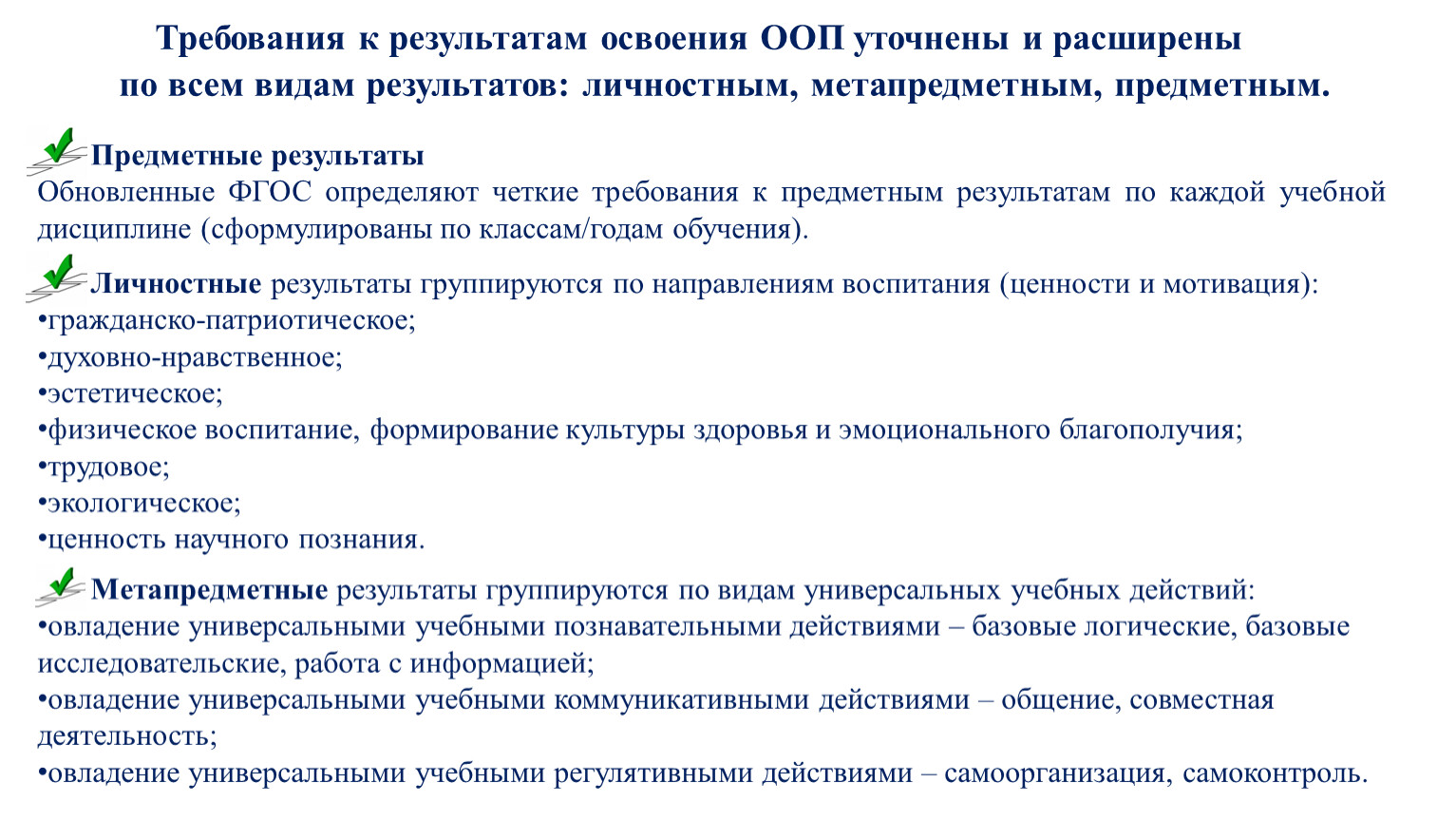 Обновленные ФГОС определяют четкие требования к предметным результатам по каждой учебной дисциплине (сформулированы по классам/годам обучения).