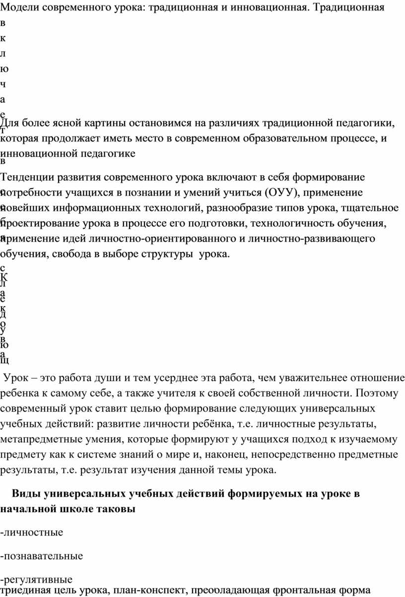 Модели современного урока: традиционная и инновационная. Традиционная включает в себя следующие компоненты: триединая цель урока, план-конспект, преобладающая фронтальная форма обучения, методы и приемы обучения, типы уроков. Инновационная модель в свою очередь делится на деятельностную и развивающую. Включает в себя следующие компоненты: ключевые и базовые компетентности, обязательное проектирование урока учителем, разнообразные формы обучения, технологическую карту урока, практический опыт деятельности.