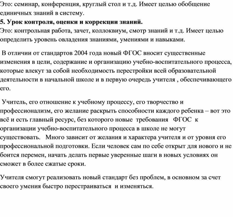 Учитель, его отношение к учебному процессу, его творчество и профессионализм, его желание раскрыть способности каждого ребенка – вот это всё и есть главный ресурс, без которого новые требования ФГОС к организации учебно-воспитательного процесса в школе не могут существовать. Много зависит от желания и характера учителя и от уровня его профессиональной подготовки. Если человек сам по себе открыт для нового и не боится перемен, начать делать первые уверенные шаги в новых условиях он сможет в более сжатые сроки.