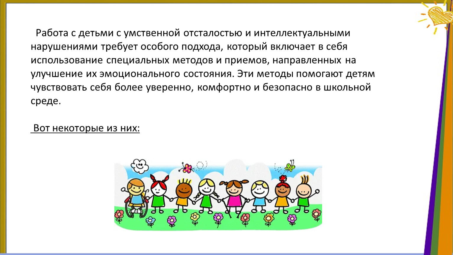 Работа с детьми с умственной отсталостью и интеллектуальными нарушениями требует особого подхода, который включает в себя использование специальных методов и приемов, направленных на улучшение их эмоционального состояния. Эти методы помогают детям чувствовать себя более уверенно, комфортно и безопасно в школьной среде.