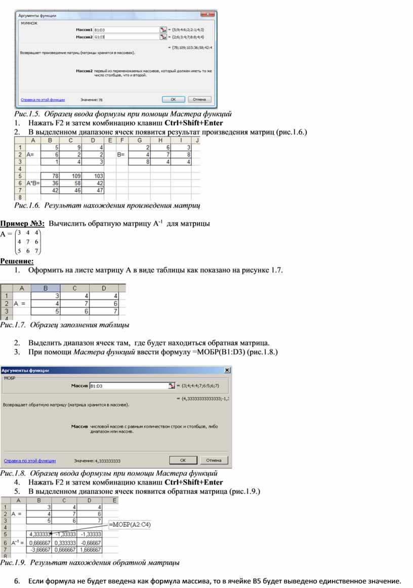 5. В выделенном диапазоне ячеек появится обратная матрица (рис.1.9.)