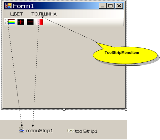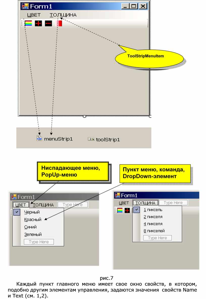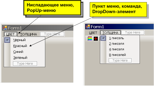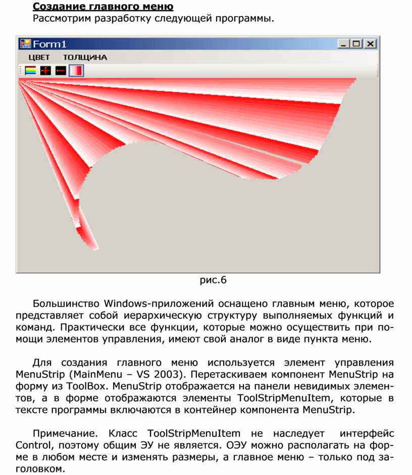 Примечание. Класс ToolStripMenuItem не наследует интерфейс Control, поэтому общим ЭУ не является. ОЭУ можно располагать на фор- ме в любом месте и изменять размеры, а главное меню – только под за- головком.