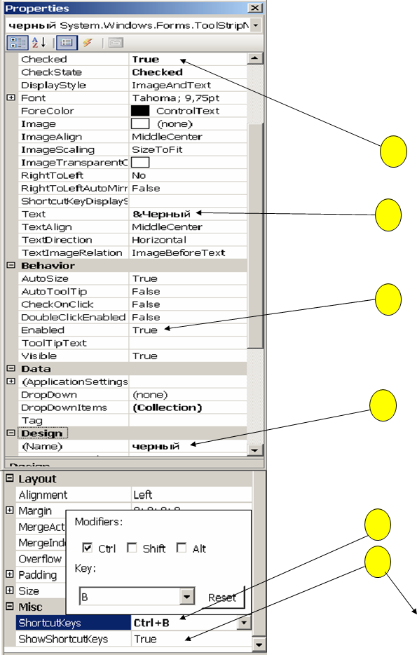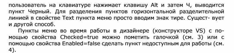 Пункты меню во время работы в дизайнере (конструкторе VS) с по- мощью свойства Checked=true можно пометить галочкой (см. 3) или с помощью свойства Enabled=false сделать пункт недоступным для работы (см. 4).