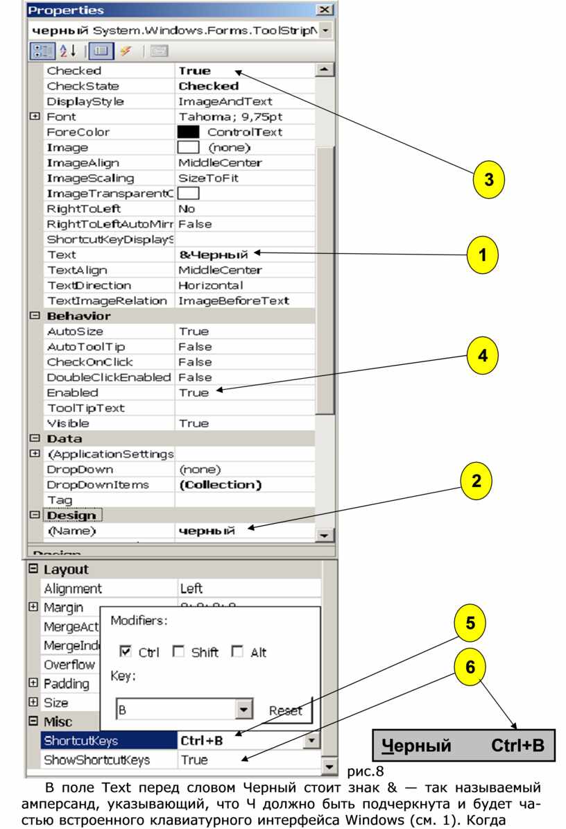 В поле Text перед словом Черный стоит знак & — так называемый амперсанд, указывающий, что Ч должно быть подчеркнута и будет ча- стью встроенного клавиатурного интерфейса Windows (см. 1). Когда