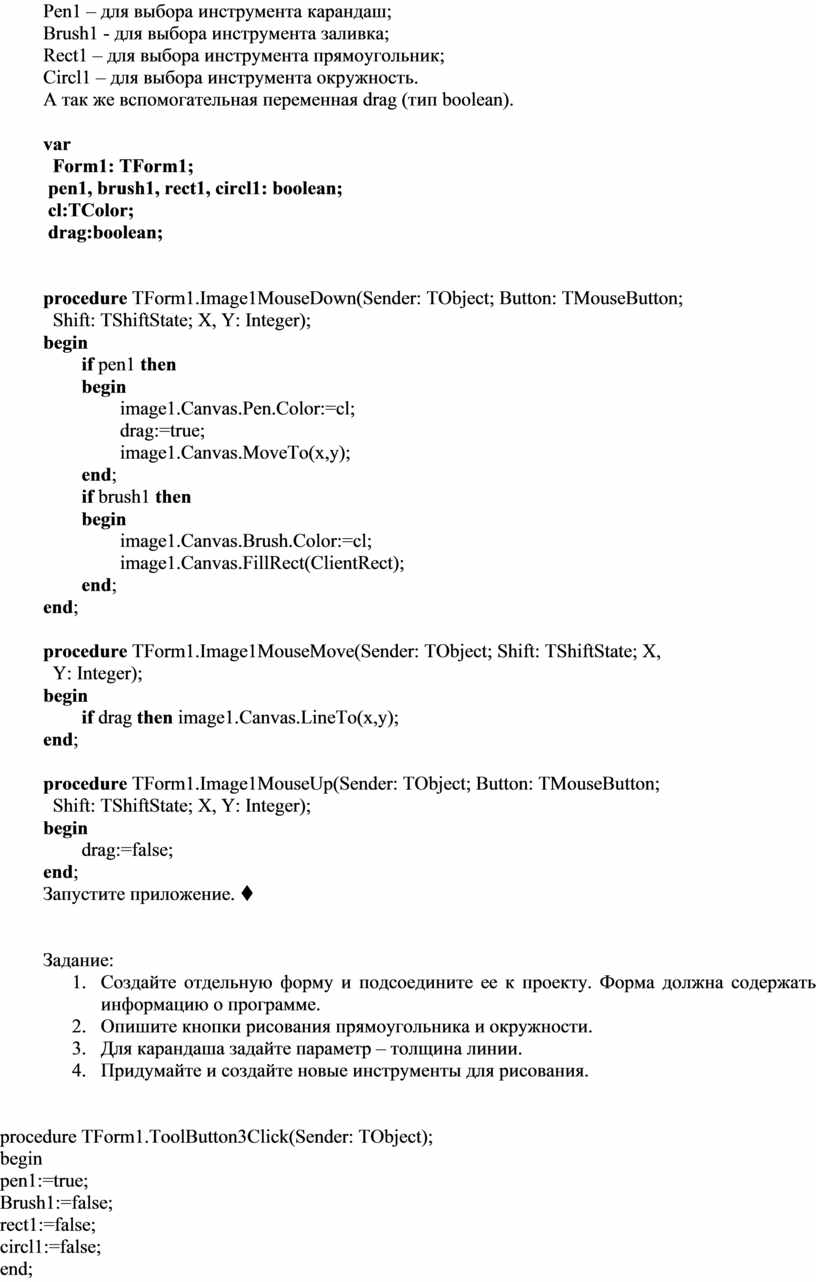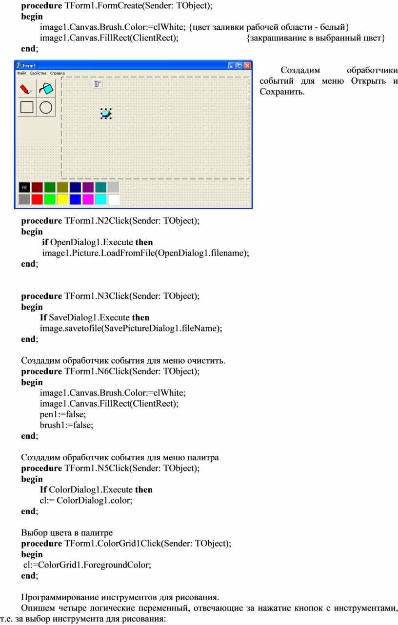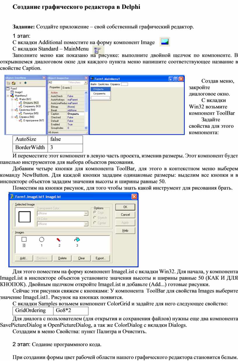 Для диалога с пользователем (для открытия и сохранения файлов) нужны еще два компонента SavePictureDialog и OpenPictureDialog, а так же ColorDialog с вкладки Dialogs.