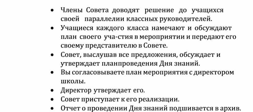 · Совет, выслушав все предложения, обсуждает и утверждает план проведения Дня знаний.
