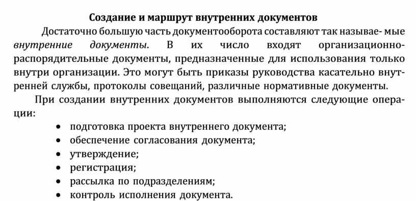 Достаточно большую часть документооборота составляют так называе- мые внутренние документы. В их число входят организационно- распорядительные документы, предназначенные для использования только внутри организации. Это могут быть приказы руководства касательно внут- ренней службы, протоколы совещаний, различные нормативные документы.