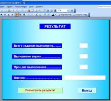 а) Разместить на слайде надписи: РЕЗУЛЬТАТ, ВСЕГО ЗАДАНИЙ ВЫПОЛНЕНО, ВЫПОЛНЕНО ВЕРНО, ПРОЦЕНТ ВЫПОЛНЕНИЯ, ОЦЕНКА.
