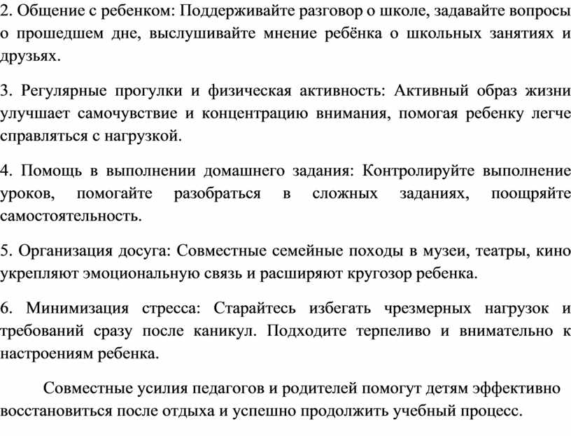 Совместные усилия педагогов и родителей помогут детям эффективно восстановиться после отдыха и успешно продолжить учебный процесс.