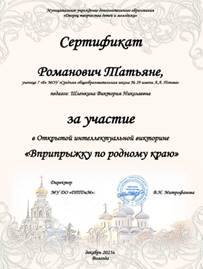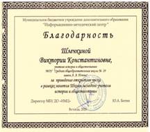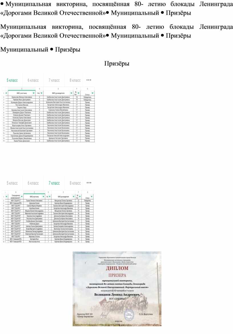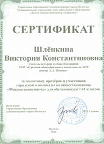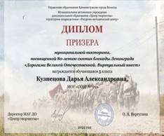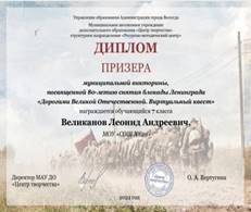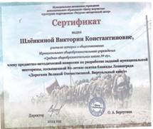Член предметно- методической комиссии по разработке заданий муниципальной викторины, посвященной 80-летию снятия блокады Ленинграда «Дорогами Великой Отечественной. Виртуальный квест» |