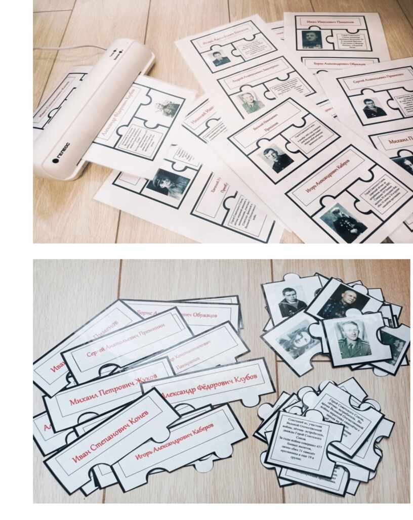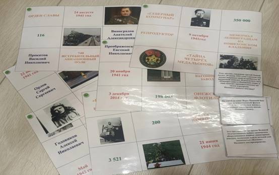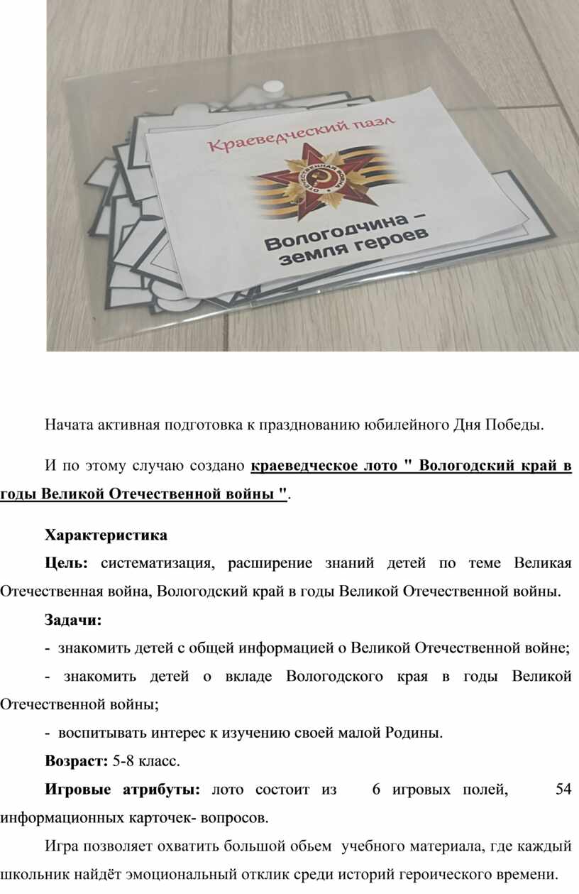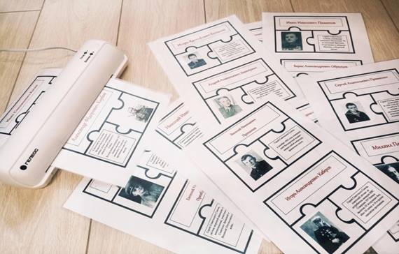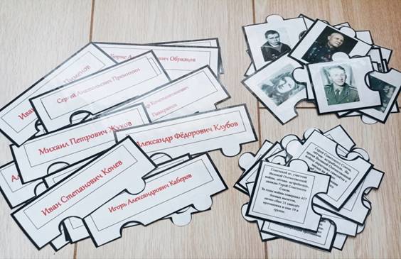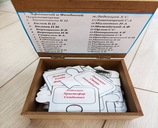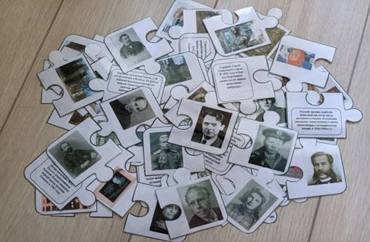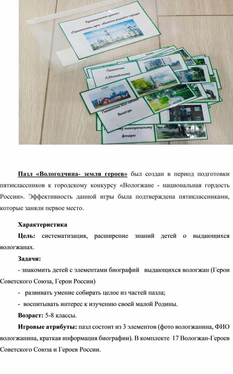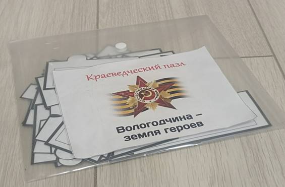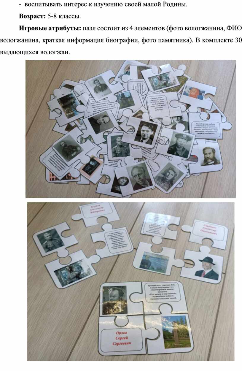 Игровые атрибуты: пазл состоит из 4 элементов (фото вологжанина, ФИО вологжанина, краткая информация биографии, фото памятника). В комплекте 30 выдающихся вологжан.
