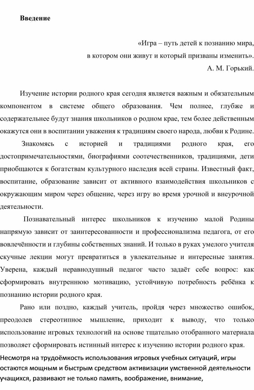 Знакомясь с историей и традициями родного края, его достопримечательностями, биографиями соотечественников, традициями, дети приобщаются к богатствам культурного наследия всей страны. Известный факт, воспитание, образование зависит от активного взаимодействия школьников с окружающим миром через общение, через игру во время урочной и внеурочной деятельности.