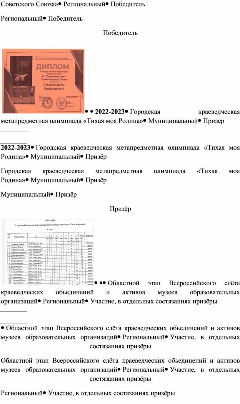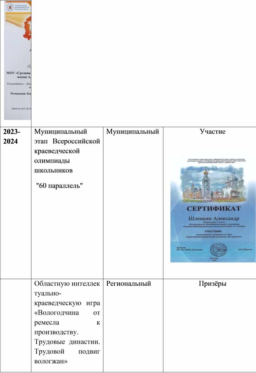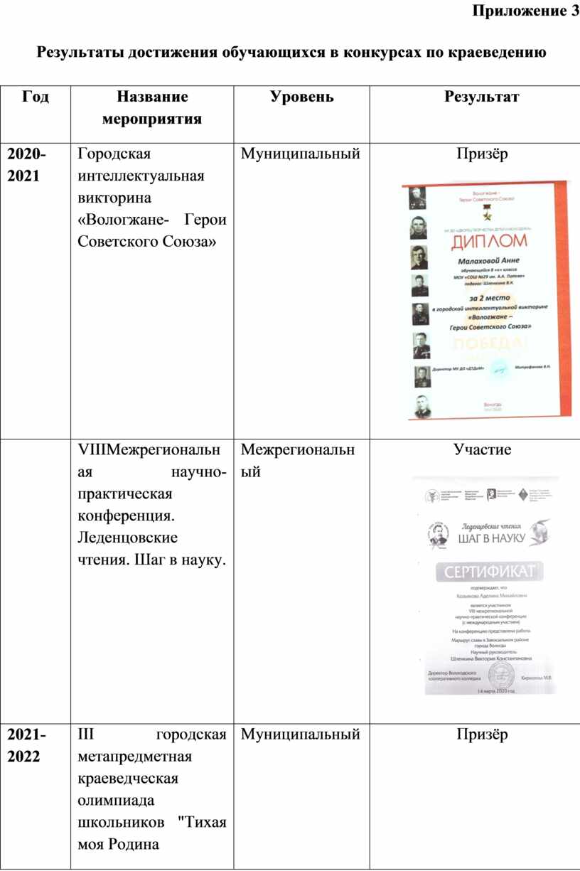 Результаты достижения обучающихся в конкурсах по краеведению