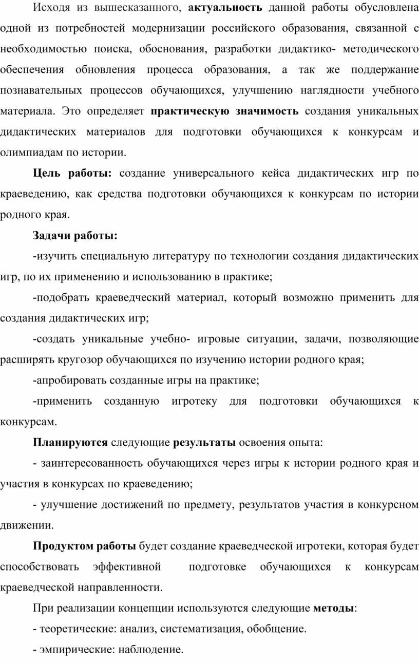 Цель работы: создание универсального кейса дидактических игр по краеведению, как средства подготовки обучающихся к конкурсам по истории родного края.