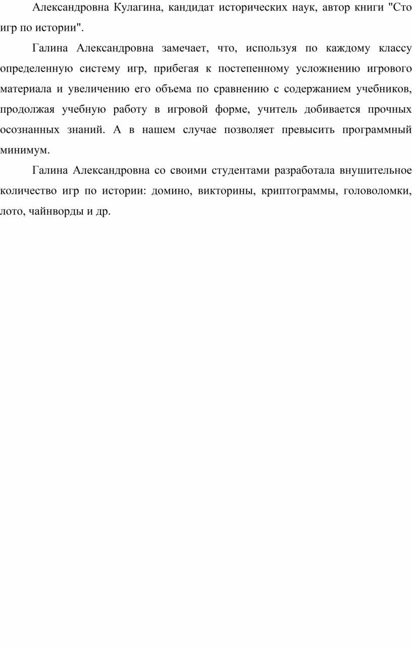 Об опыте создания дидактических игр по истории и последующего их использования во внеклассной и учебной работе еще говорила Галина Александровна Кулагина, кандидат исторических наук, автор книги "Сто игр по истории".