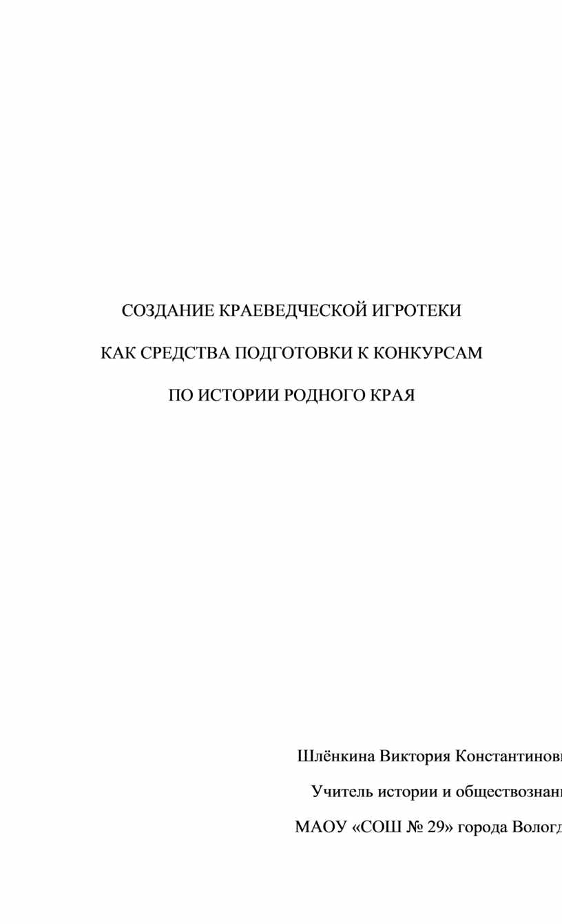 СОЗДАНИЕ КРАЕВЕДЧЕСКОЙ ИГРОТЕКИ КАК СРЕДСТВА ПОДГОТОВКИ К КОНКУРСАМ ПО ИСТОРИИ РОДНОГО КРАЯ |