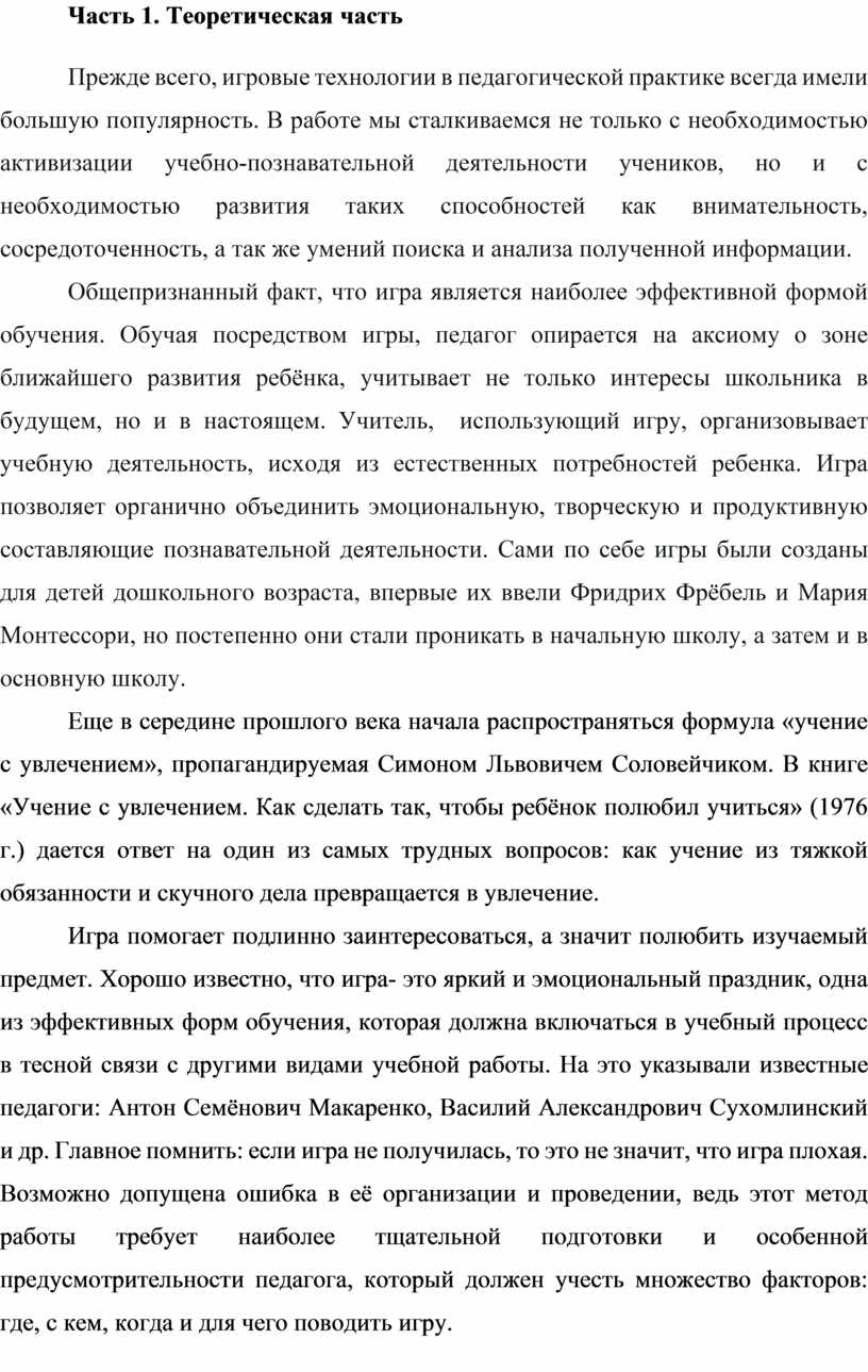 Игра помогает подлинно заинтересоваться, а значит полюбить изучаемый предмет. Хорошо известно, что игра- это яркий и эмоциональный праздник, одна из эффективных форм обучения, которая должна включаться в учебный процесс в тесной связи с другими видами учебной работы. На это указывали известные педагоги: Антон Семёнович Макаренко, Василий Александрович Сухомлинский и др. Главное помнить: если игра не получилась, то это не значит, что игра плохая. Возможно допущена ошибка в её организации и проведении, ведь этот метод работы требует наиболее тщательной подготовки и особенной предусмотрительности педагога, который должен учесть множество факторов: где, с кем, когда и для чего поводить игру.