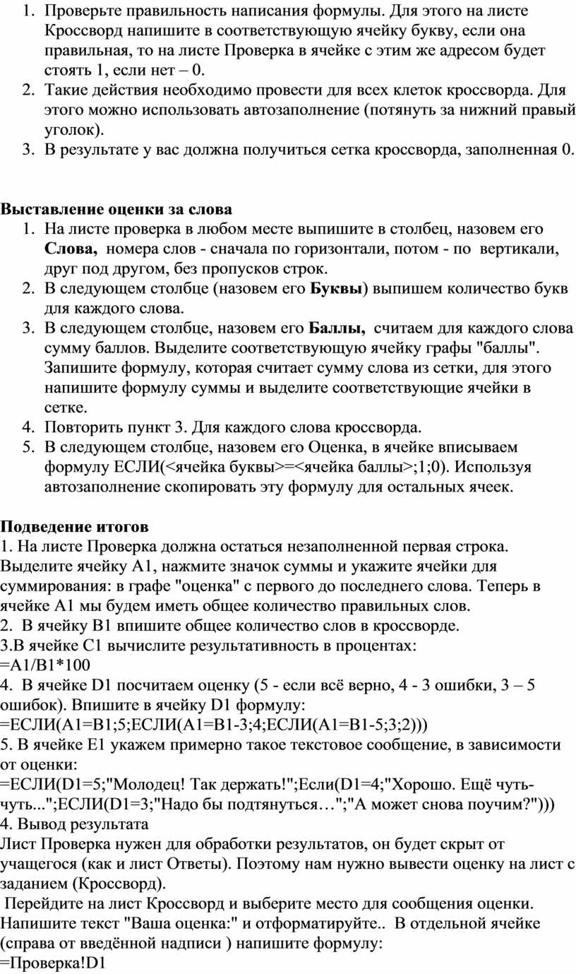 Перейдите на лист Кроссворд и выберите место для сообщения оценки. Напишите текст "Ваша оценка:" и отформатируйте.. В отдельной ячейке (справа от введённой надписи ) напишите формулу: