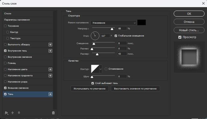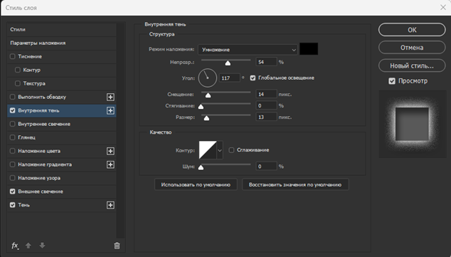 10. Добавим стиль «Внутренняя тень» (Inner Shadow) с настройками: