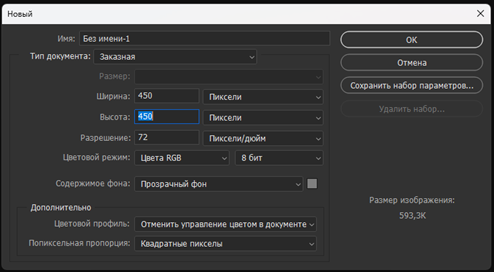 1. Создать новый документ размером 450х450 пикс. Разрешение 72 dpi