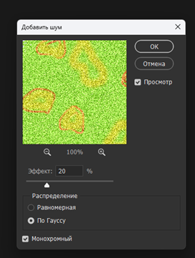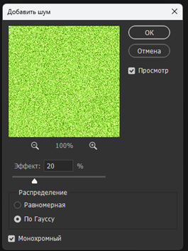 4. Отменим выделение. Теперь выберем Фильтр-Шум-Добавить шум (Filter-Noise-Add noise) с такими настройками: