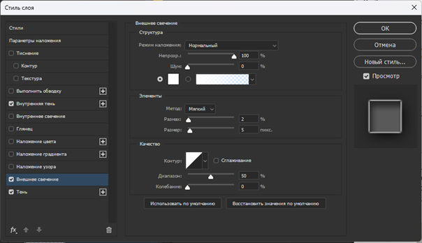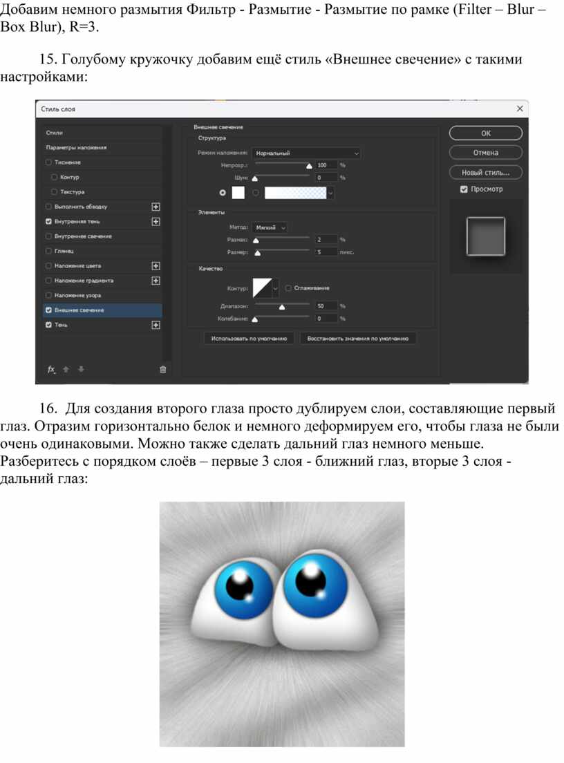 15. Голубому кружочку добавим ещё стиль «Внешнее свечение» с такими настройками: