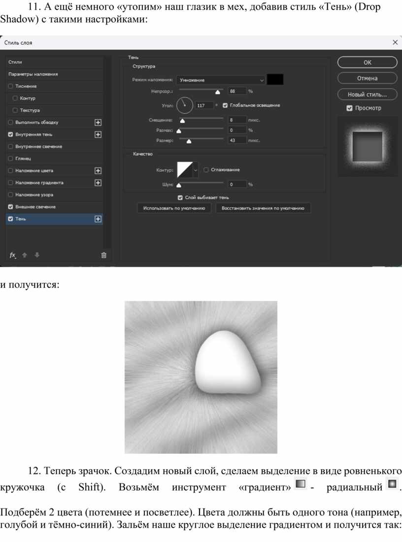11. А ещё немного «утопим» наш глазик в мех, добавив стиль «Тень» (Drop Shadow) с такими настройками: