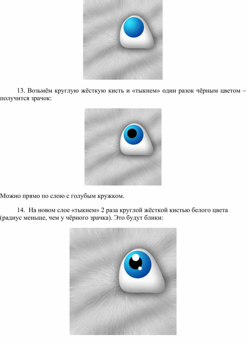 13. Возьмём круглую жёсткую кисть и «тыкнем» один разок чёрным цветом – получится зрачок: