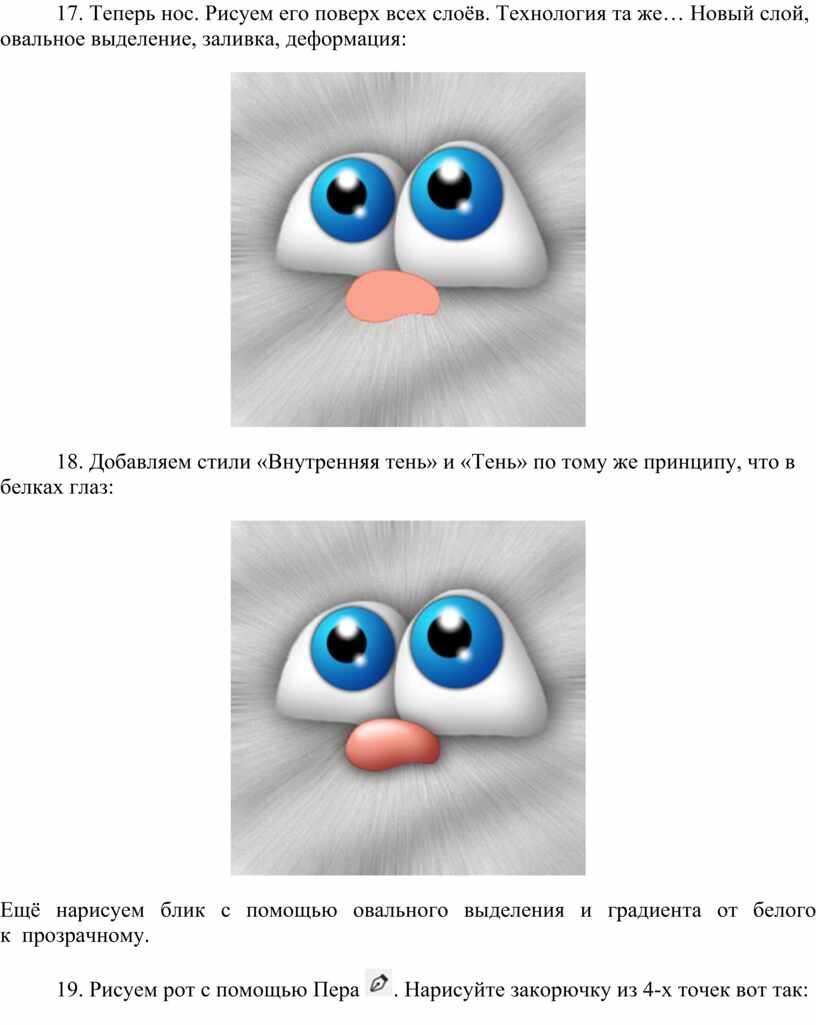 17. Теперь нос. Рисуем его поверх всех слоёв. Технология та же… Новый слой, овальное выделение, заливка, деформация: