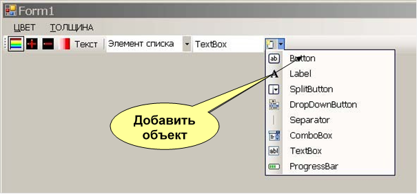 Перетащим на форму из окна ToolBox компонент ToolStrip.