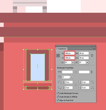 Добавьте пару окон к структуре, создав немного более темный квадрат (# F0D3D3) размером 10 x 10 и расположив его, используя следующие координаты: