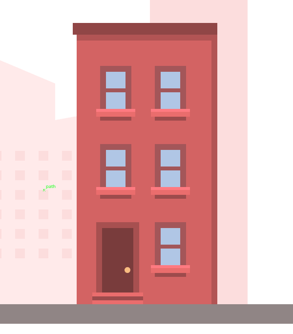 Перейдя к пятому и последнему дому, мы начнем с создания базы размером 216 х 160 пикселей и расположим ее справа от нашего предыдущего здания. Задайте ему немного темный цвет # D46363, а затем добавьте две тени (# C25B5B), одну слева и одну сверху, сохраняя постоянную ширину 6 пикселей .