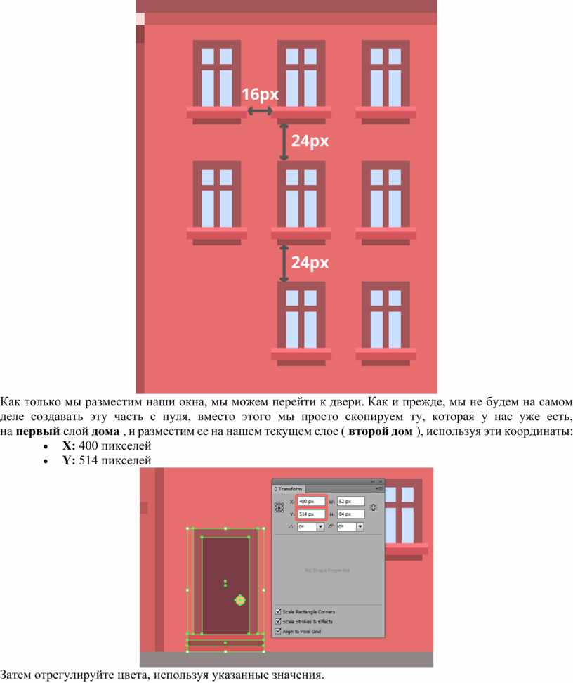 Далее, если у вас есть первый экземпляр окна, сгруппированный ( Ctrl + J ), создайте две копии и выровняйте их вправо на расстоянии 16 пикселей друг от друга. Снова сгруппируйте их и дважды продублируйте ряд, сохраняя расстояние 24 пикселя между ними, удалив левые боковые окна в третьем ряду, чтобы освободить место для двери, убедившись, что все окна сгруппированы вместе (выделите их все> Ctrl + G). ).