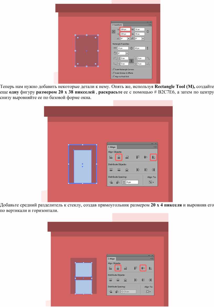 Создайте подоконник, нарисовав немного светлый (# EB6D6D) прямоугольник размером 40 x 8 пикселей и расположив его под базовой формой окна. Добавьте небольшую подсветку, создав меньшую форму размером 40 x 3 пикселя и выровняв ее по вертикали сверху по отношению к предыдущей.