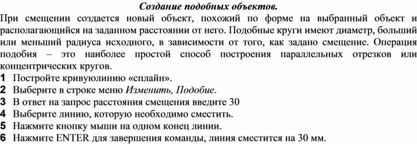 При смещении создается новый объект, похожий по форме на выбранный объект и располагающийся на заданном расстоянии от него. Подобные круги имеют диаметр, больший или меньший радиуса исходного, в зависимости от того, как задано смещение. Операция подобия – это наиболее простой способ построения параллельных отрезков или концентрических кругов.