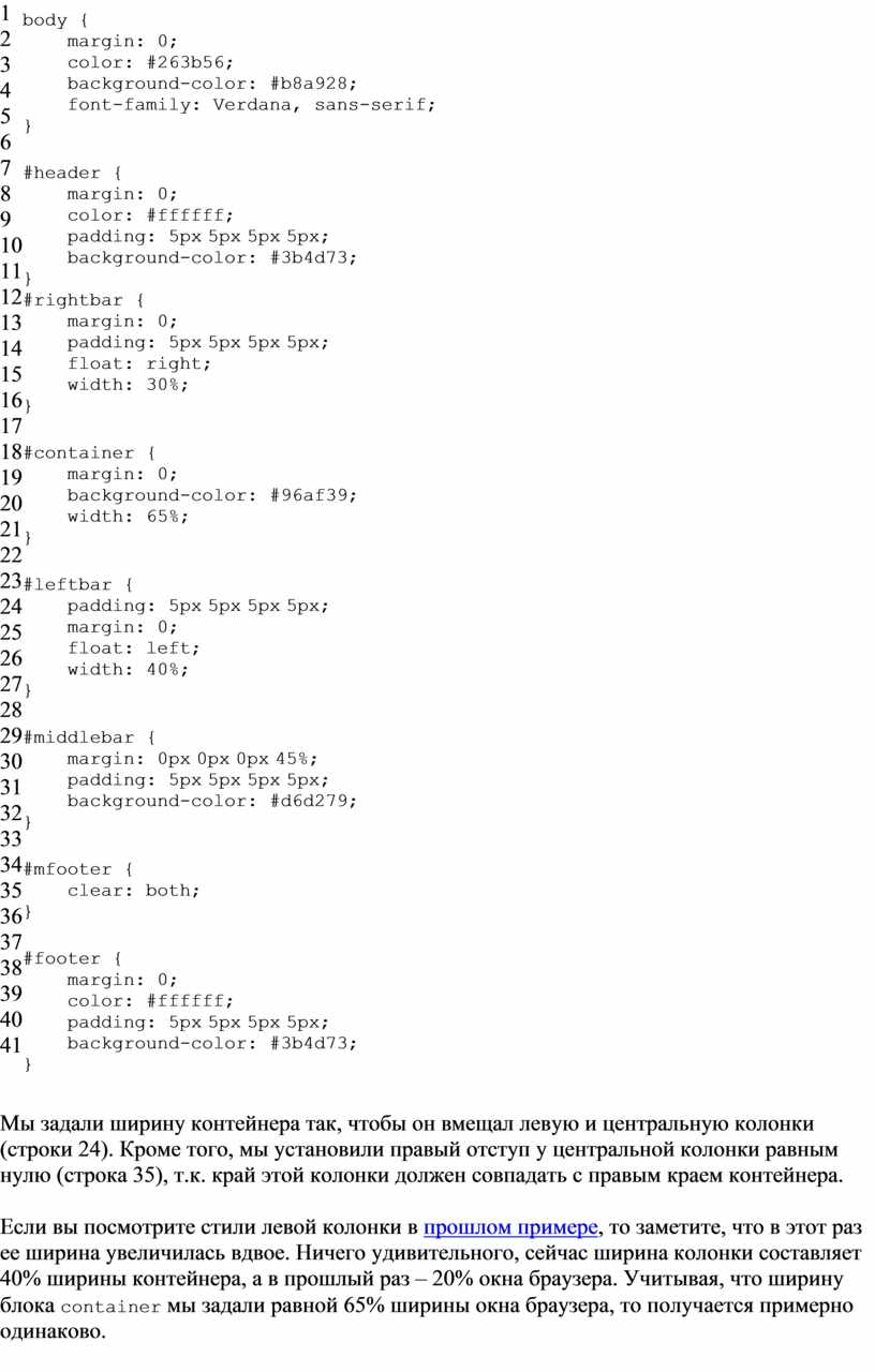 Если вы посмотрите стили левой колонки в прошлом примере, то заметите, что в этот раз ее ширина увеличилась вдвое. Ничего удивительного, сейчас ширина колонки составляет 40% ширины контейнера, а в прошлый раз – 20% окна браузера. Учитывая, что ширину блока container мы задали равной 65% ширины окна браузера, то получается примерно одинаково.