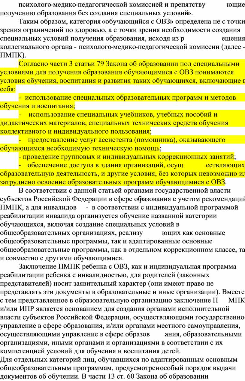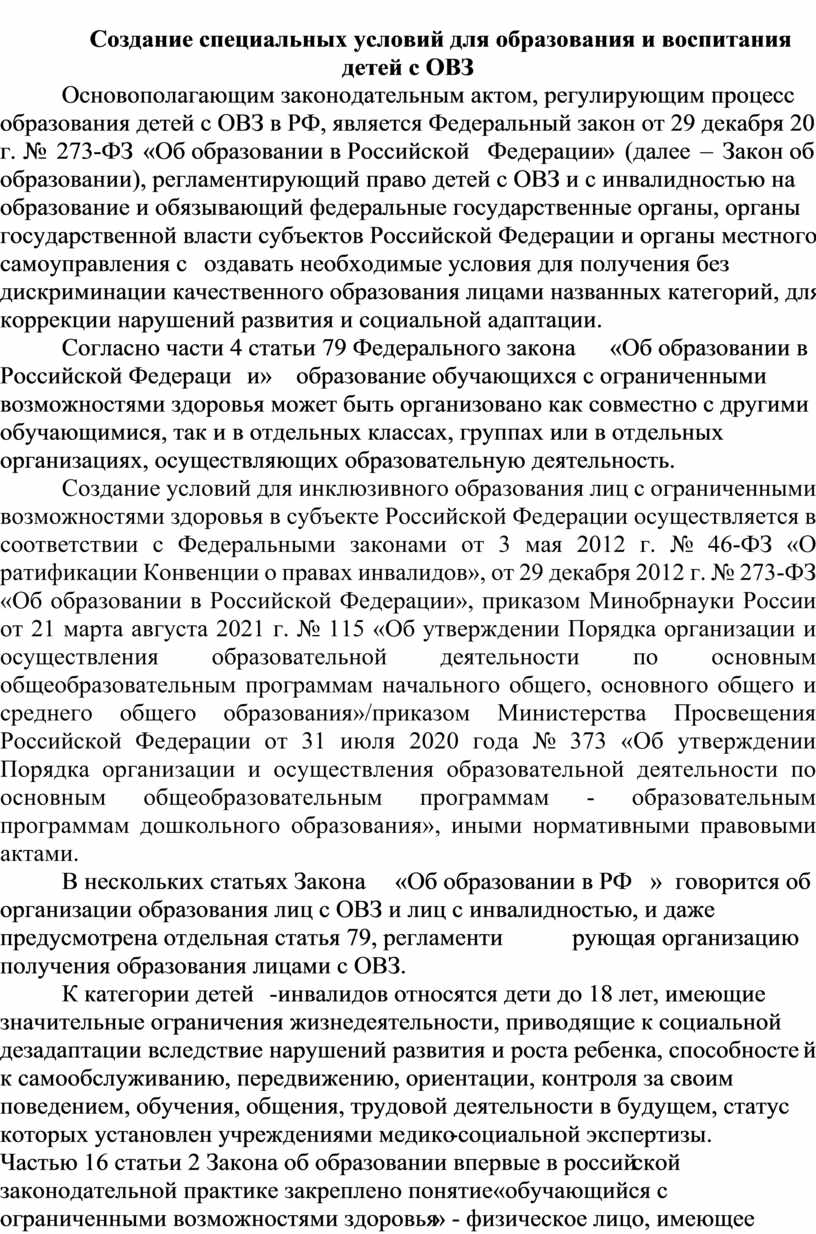 Основополагающим законодательным актом, регулирующим процесс образования детей с ОВЗ в РФ, является Федеральный закон от 29 декабря 2012 г. № 273-ФЗ «Об образовании в Российской Федерации» (далее – Закон об образовании), регламентирующий право детей с ОВЗ и с инвалидностью на образование и обязывающий федеральные государственные органы, органы государственной власти субъектов Российской Федерации и органы местного самоуправления создавать необходимые условия для получения без дискриминации качественного образования лицами названных категорий, для коррекции нарушений развития и социальной адаптации.