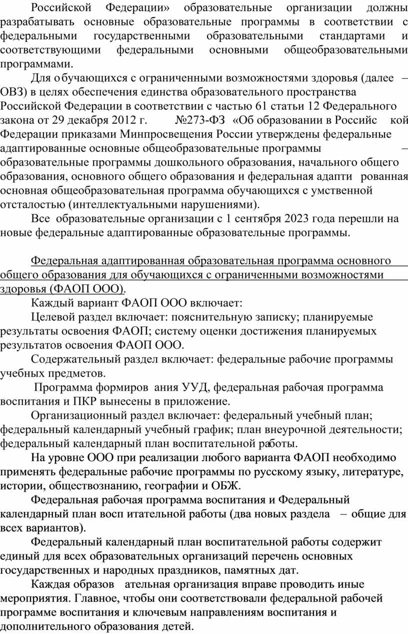Для обучающихся с ограниченными возможностями здоровья (далее – ОВЗ) в целях обеспечения единства образовательного пространства Российской Федерации в соответствии с частью 61 статьи 12 Федерального закона от 29 декабря 2012 г. №273-ФЗ «Об образовании в Российской Федерации приказами Минпросвещения России утверждены федеральные адаптированные основные общеобразовательные программы – образовательные программы дошкольного образования, начального общего образования, основного общего образования и федеральная адаптированная основная общеобразовательная программа обучающихся с умственной отсталостью (интеллектуальными нарушениями).