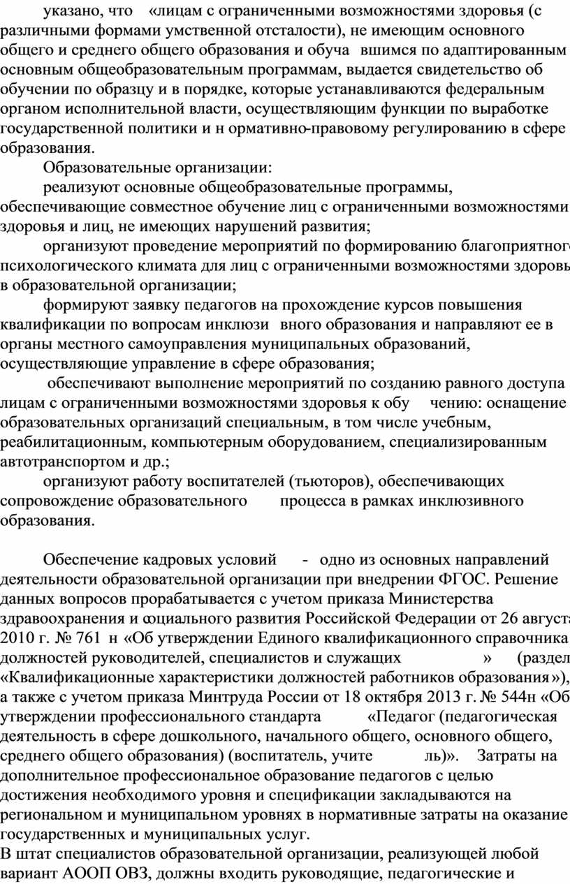 В штат специалистов образовательной организации, реализующей любой вариант АООП ОВЗ, должны входить руководящие, педагогические и иные работники, имеющие необходимый уровень образования и квалификации для каждой занимаемой должности, который должен соответствовать квалификационным требованиям, указанным в квалификационных справочниках и (или) профессиональных стандартах с учетом профиля ограниченных возможностей здоровья обучающихся, в том числе учитель начальных классов, учитель музыки, учитель рисования, учитель физической культуры, учитель иностранного языка, воспитатель, педагог-психолог, социальный педагог, педагог-организатор, педагог дополнительного образования, учитель-логопед, дефектолог (тифлопедагог, сурдопедагог, олигофренопедагог). При необходимости в процессе реализации АООП ОВЗ возможно временное или постоянное участие тьютора, в том числе рекомендуемого ПМПК для конкретного ребенка с ОВЗ, и (или) ассистента (помощника), рекомендуемого Бюро МСЭ (медико-социальной экспертизы) для ребенка с нарушениями опорно-двигательного аппарата.