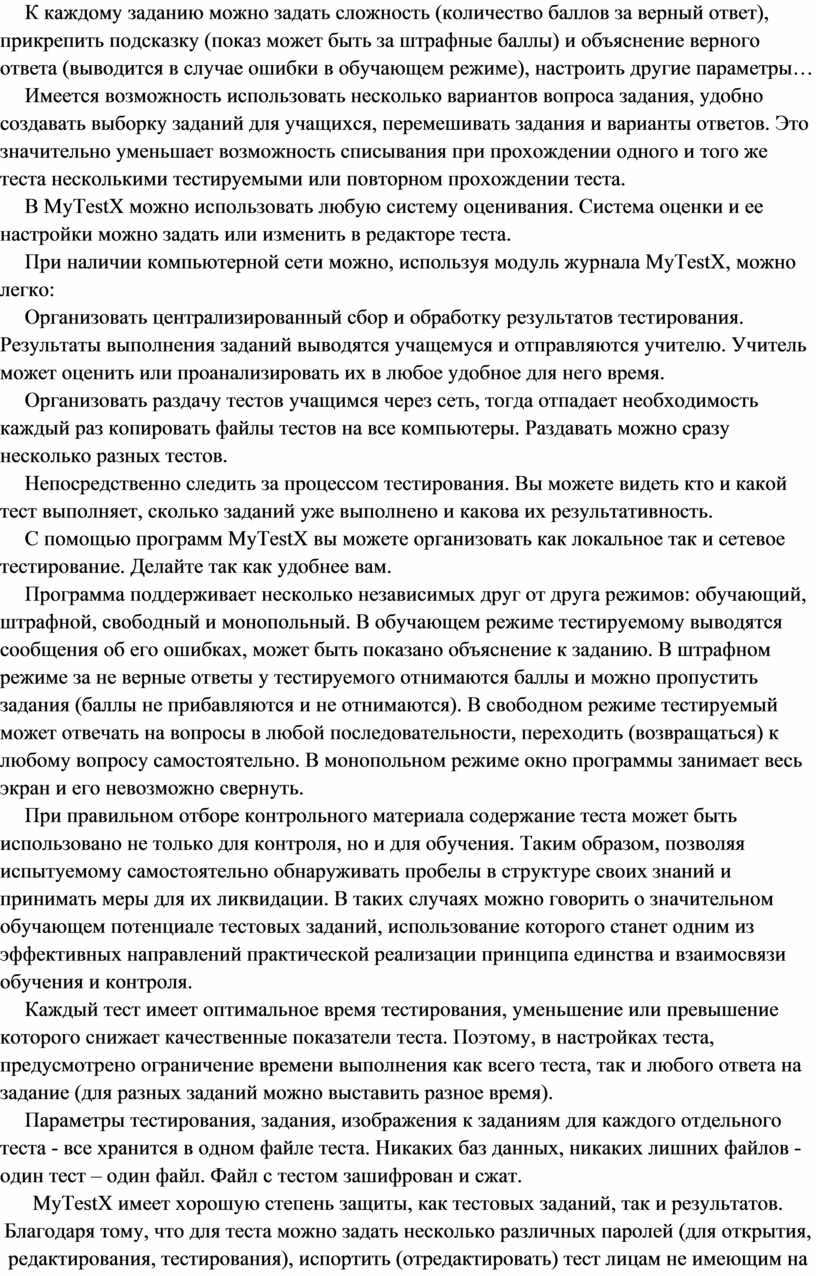 Для создания тестов имеется очень удобный редактор тестов с дружественным интерфейсом. Любой учитель-предметник, даже владеющий компьютером на начальном уровне, может легко составить свои тесты для программы MyTestX и использовать их на уроках.