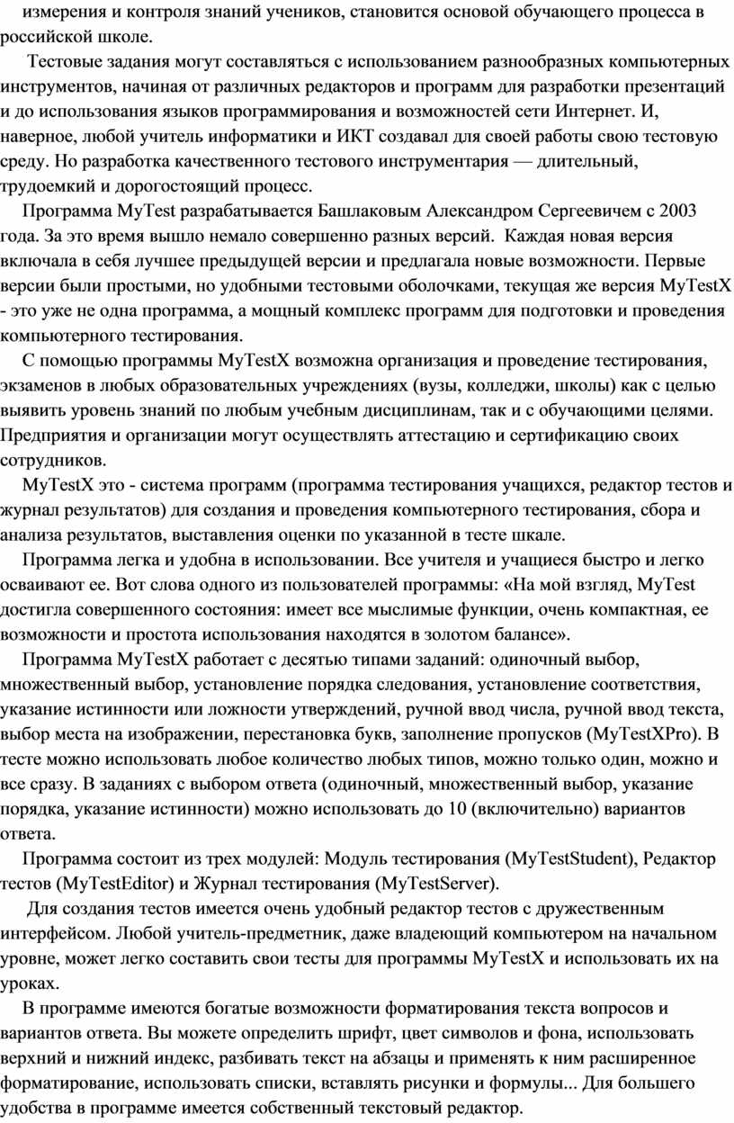 Программа MyTest разрабатывается Башлаковым Александром Сергеевичем с 2003 года. За это время вышло немало совершенно разных версий. Каждая новая версия включала в себя лучшее предыдущей версии и предлагала новые возможности. Первые версии были простыми, но удобными тестовыми оболочками, текущая же версия MyTestX - это уже не одна программа, а мощный комплекс программ для подготовки и проведения компьютерного тестирования.