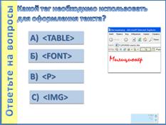 1. Какой тег используется для форматирования текста? ОТВЕТ: Б)FONT (если учащиеся дают правильный ответ, то осуществляется переход на слайд с ответом «правильно», иначе на слайд с ответом «неправильно». 2. Какие атрибуты тега FONT можно использовать для оформления текста? (face, color, size)