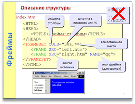Педагогические задачи: создать условия для ознакомления с метками <Frame>, способствовать формированию представления о создании Web-сайта с использованием фреймов.