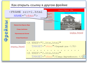 Для того, чтобы организовать загрузку страницы в нужный фрейм, необходимо на странице определяющей структуру всего сайта index.html данному фрейму присвоить имя с помощью атрибута NAME. А на странице, в которой описаны ссылки дополнить, тег <A HREF..> параметром TARGET=ИМЯ фрейма.