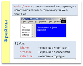 Использование фреймов подразумевает создание нескольких независимых информационных документов, загружаемых каждый в свой фрейм, и созданием специального файла, определяющего структуру документа. Определение: Фрейм – это часть сложной web-страницы, в которую может быть загружена другая web-страница.