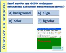 2. Какой атрибут тега <BODY> необходимо использовать для заливки фона страницы цветом? Ответ: bgcolor. (если учащиеся правильно дают ответ, то появляется ответ «правильно», иначе «неправильно»)